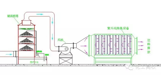 原理:反應(yīng)塔內(nèi)裝填特制的固態(tài)填料,填料內(nèi)部復(fù)配多介質(zhì)催化劑。當(dāng)惡臭氣體在引風(fēng)機(jī)的作用下穿過填料層,與通過特制噴嘴呈發(fā)散霧狀噴出的液相復(fù)配氧化劑在固相填料表面充分接觸,并在多介質(zhì)催化劑的催化作用下,惡臭氣體中的污染因子被充分分解。適用范圍:適用范圍廣,尤其適用于處理大氣量、中高濃度的廢氣,對疏水性污染物質(zhì)有很好的去除率。優(yōu)點(diǎn):占地小,投資低,運(yùn)行成本低;管理方便,即開即用。缺點(diǎn):耐沖擊負(fù)荷,不易污染物濃度及溫度變化影響,需消耗一定量的藥劑。
